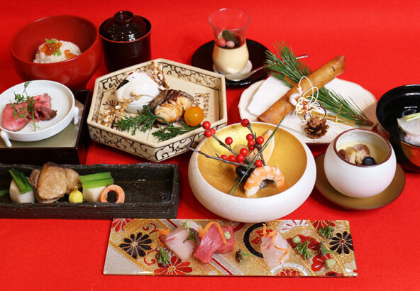 新春会席「舞」(2名様より)1月限定 お一人様 10000円 新春の思いを込めて、華やかな事をご用意。新年を迎える慶びを、姿を変えた食材に舌鼓し、盃を交わし英気をも養って下さい。 〈先付〉 花棚菜すり流し あん肝鮑...