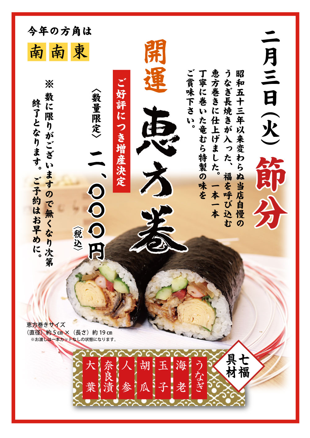 大変ご好評につき、恵方巻きを若干数追加でご用意できることになりました。